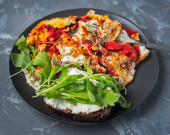 Obiad z mięsem z kurczaka na omlecie jajecznym na lekkim talerzu