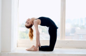 Kobieta w ciemnych ciuchach siedzi skrzyżowana na podłodze i gesty dłońmi w jogi asana