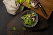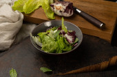 Wegetariańska sałatka z warzyw, cebuli, pomidorów wiśniowych, czerwonej i żółtej papryki i zieleni z serem mozzarella. Świeża sałatka letnia przystawka.