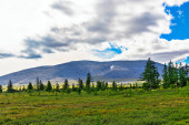 Brudna droga przez północną tajgę do gór na Ural Subpolarnych w letni dzień