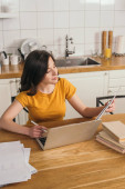 Młoda urocza ciężarna dziewczyna freelancer pracuje w domu w kuchni w trybie samoizolacji w kwarantannie. Dostosowanie.