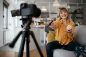 Zdjęcie "Młoda, ładna ciężarna dziewczyna pracuje w domu w trybie samokontroli w kwarantannie i nagrywa filmy na swoim smartfonie. Dostosowanie." może być wykorzystywane do celów osobistych i komercyjnych zgodnie z warunkami zakupionej licencji Royalty-free. Obraz jest dostępny do pobrania w jakości wysokiej rozdzielczości do 5760x3840.
