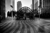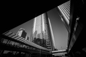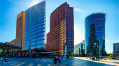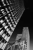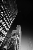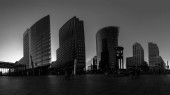 Berlin, Niemcy - 19 grudnia 2020 - Jeden z najsłynniejszych placów w Berlinie (Niemcy), Potsdamer Platz ze słynnymi drapaczami chmur w czerni i bieli