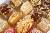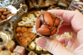 strony bierze wschodnie słodycze z orzechami, daty, cukierki w metalowym wazonie na drewnianym tle, zbliżenie