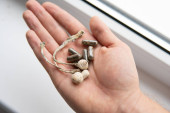 Wysuszyć Psilocybe cubensis. Grzyb psylocybiny w ręku. Psychodeliczne mikrodawkowanie. Magiczny grzybek. mikro-dawkowanie energii Leki fizyczne