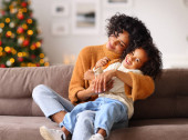 Portret szczęśliwej pięknej Afroamerykanki bawiącej się z małym dzieckiem, siedzącej na kanapie w urządzonym pokoju Bożonarodzeniowym Widok z boku kochającej mamy i dziecka spędzającego razem czas Koncepcja świąt