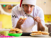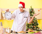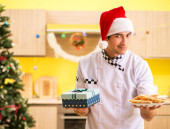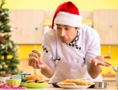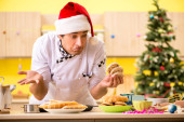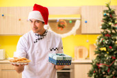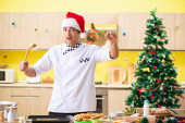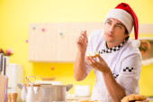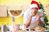 Młody kucharz mąż pracuje w kuchni, w Wigilię Bożego Narodzenia