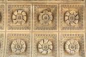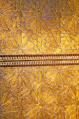 Wygiezlow, Polska - 14 sierpnia 2020: Stary piec kaflowy z ręcznie malowanymi płytkami w skansenze w Wygiezwie. Polska.