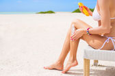 kobieta w bikini stosowania ochrony przeciwsłonecznej w morza