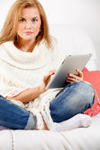 Zdjęcie "młoda kobieta za pomocą cyfrowego tabletu" może być wykorzystywane do celów osobistych i komercyjnych zgodnie z warunkami zakupionej licencji Royalty-free. Obraz jest dostępny do pobrania w jakości wysokiej rozdzielczości do 5760x3840.