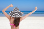 yyoung kobieta stoi rękoma wzniesionymi na plaży z morza