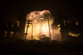 Zdjęcie "spalenie zrujnowanego miasta apokaliptycznego. Widok na Armagedon. Realistyczna symulacja ognia. Postapokaliptyczne. 3d renderowanie" może być wykorzystywane do celów osobistych i komercyjnych zgodnie z warunkami zakupionej licencji Royalty-free. Obraz jest dostępny do pobrania w jakości wysokiej rozdzielczości do 5760x3840.