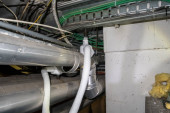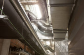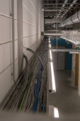 Zdjęcie "W korytarzu dużego budynku kable elektryczne wiszą na suficie w kanale kablowym" może być wykorzystywane do celów osobistych i komercyjnych zgodnie z warunkami zakupionej licencji Royalty-free. Obraz jest dostępny do pobrania w jakości wysokiej rozdzielczości do 5760x3840.