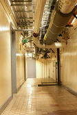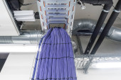 W korytarzu dużego budynku kable elektryczne wiszą na suficie w kanale kablowym