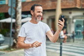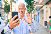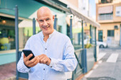 Łysy mężczyzna w średnim wieku uśmiecha się szczęśliwy za pomocą smartfona w mieście.