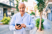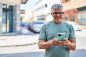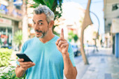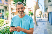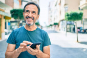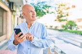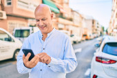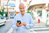 Zdjęcie "Łysy mężczyzna w średnim wieku uśmiecha się szczęśliwy za pomocą smartfona w mieście." może być wykorzystywane do celów osobistych i komercyjnych zgodnie z warunkami zakupionej licencji Royalty-free. Obraz jest dostępny do pobrania w jakości wysokiej rozdzielczości do 5760x3840.
