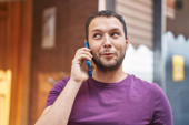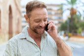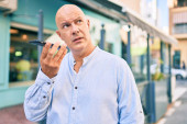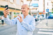 Łysy mężczyzna w średnim wieku uśmiecha się szczęśliwy rozmawiając na smartfonie w mieście.
