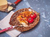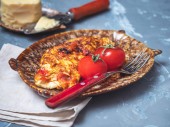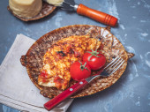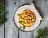 Białkowe śniadanie. Smażone mięso z kurczaka na omlecie jajecznym na okrągłym talerzu. Widok z góry. Podawany na niebieskiej tacy ozdobionej gałązkami jodły