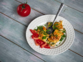 Zdjęcie "Białkowe śniadanie. Smażone mięso z kurczaka na omlecie jajecznym na okrągłym talerzu. Widok z góry. Podawany na niebieskiej tacy ozdobionej gałązkami jodły" może być wykorzystywane do celów osobistych i komercyjnych zgodnie z warunkami zakupionej licencji Royalty-free. Obraz jest dostępny do pobrania w jakości wysokiej rozdzielczości do 5760x3840.
