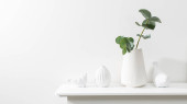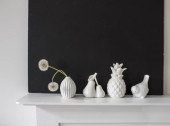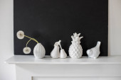 Bukiet różowych róż w szklanej figurce wazonu na białej konsoli kominkowej. Figurka fajansowa dwóch gruszek i ptaka jako dekoracja wnętrz. Odbiór. Róża Biała Różowa O 'Hara.