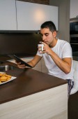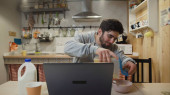 mężczyzna w średnim wieku pracuje w domu i używa telefonu komórkowego i laptopa. Mężczyzna pijący kawę i oglądający komputer. Szczęśliwa uśmiechnięta buzia. wnętrze kuchni na tle.