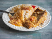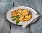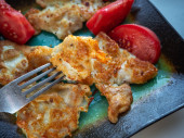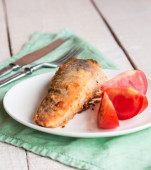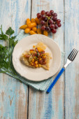 Domowy obiad z ryżem i smażonym sosem rybnym na okrągłym talerzu i widelcem na drewnianej niebieskiej tacy