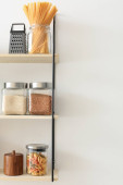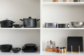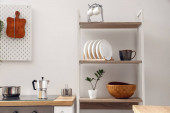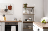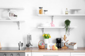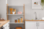 Zdjęcie "Wnętrze nowoczesnej kuchni z półkami" może być wykorzystywane do celów osobistych i komercyjnych zgodnie z warunkami zakupionej licencji Royalty-free. Obraz jest dostępny do pobrania w jakości wysokiej rozdzielczości do 5760x3840.