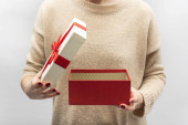 Cukierniczka w kapeluszu noworocznym prezentuje pudełko prezentów w dłoniach na tle drzewa noworocznego.