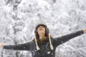 Młoda kobieta w zimowym parku w śniegu. Kobieta bawiąca się zimową przyrodą. Zimowy portret zabawnej kobiety w wełnianym kapeluszu i ciepłym szaliku rzucającej śniegiem w zimowym parku, latające płatki śniegu.