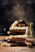 Stos kawałków lub batonika ciasta czekoladowego z truskawkami i orzechami pistacjowymi na czarnym tle, selektywny obraz ostrości.