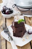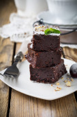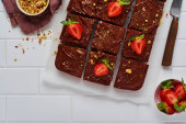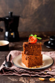 Stos kawałków lub batonika ciasta czekoladowego z truskawkami i orzechami pistacjowymi na czarnym tle, selektywny obraz ostrości.
