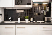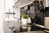 Zamazany widok na wnętrze kuchni z nowoczesnymi meblami