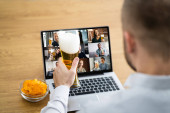 Przyjaciele pijący piwo, komunikujący się przez telekonferencję w domu. Odległość społeczna podczas pandemii koronawirusowej