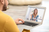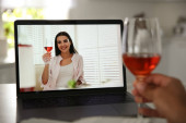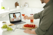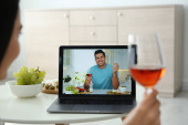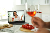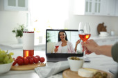 Przyjaciele pijący wino podczas komunikacji przez internetową konferencję wideo w domu. Odległość społeczna podczas pandemii koronawirusowej