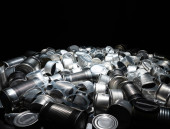 Metalowe puszki, puszki i śmieci ze słoików na stole. Śmieci z aluminium. Puste zużyte odpady opakowaniowe i złom ze stali spożywczej i napojowej, sortowane i gotowe do recyklingu.