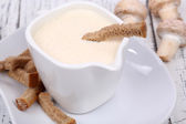delikatnym sosem grzybowym w Pucharze na drewniany stół szczegół