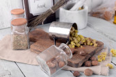 Historyczne stare butelki apteczne z etykietą na kolorowym tle drewniane