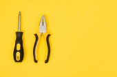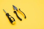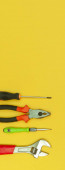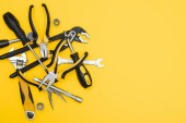 Narzędzia widok z góry na żółtym tle. Płaszczyzna, otwarte klucze, śrubokręty i zszywacz płaskie leżały z przestrzenią do kopiowania.
