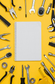 Zestaw różnych narzędzi budowlanych. Narzędzia do naprawy domu. Praca na budowie. Na żółtym tle. Płasko. Płaskowyż.