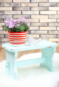 piękne kwiaty w wiklinowym koszu, na kolor tkaniny i drewniane tła