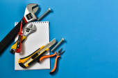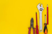 Zdjęcie "Narzędzia widok z góry na żółtym tle. Płaszczyzna, otwarte klucze, śrubokręty i zszywacz płaskie leżały z przestrzenią do kopiowania." może być wykorzystywane do celów osobistych i komercyjnych zgodnie z warunkami zakupionej licencji Royalty-free. Obraz jest dostępny do pobrania w jakości wysokiej rozdzielczości do 5760x3840.