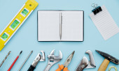 Narzędzia widok z góry na żółtym tle. Płaszczyzna, otwarte klucze, śrubokręty i zszywacz płaskie leżały z przestrzenią do kopiowania.