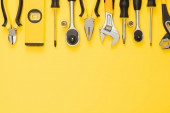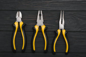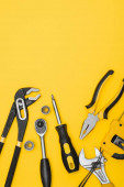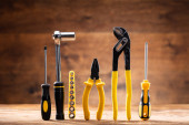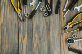 Zestaw narzędzi ręcznych. Wyposażenie na drewnianym tle