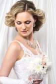pięknej narzeczonej w eleganckiej koronki biała suknia ślubna