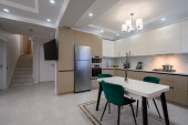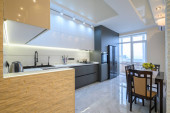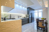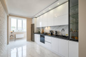 Luksusowe białe i ciemnoszare nowoczesne wnętrze kuchni