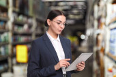 Zdjęcie "Inspektor z tabletem w hurtowni, miejsce na tekst. Kontrola jakości" może być wykorzystywane do celów osobistych i komercyjnych zgodnie z warunkami zakupionej licencji Royalty-free. Obraz jest dostępny do pobrania w jakości wysokiej rozdzielczości do 5760x3840.