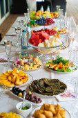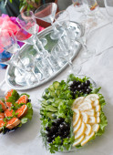 table served with light summer snacks-fruits, vegetables, berries.