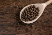 Miska z pieprzem na drewnianym stole, widok z góry