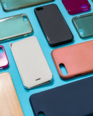 Zdjęcie "Stos kolorowych plastikowych pokryw na telefon komórkowy. Wybór akcesoriów ochronnika smartfona na niebieskim tle. Wiele silikonowych pleców lub skórek obok siebie" może być wykorzystywane do celów osobistych i komercyjnych zgodnie z warunkami zakupionej licencji Royalty-free. Obraz jest dostępny do pobrania w jakości wysokiej rozdzielczości do 5760x3840.