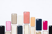 Stos kolorowych plastikowych pokryw na telefon komórkowy. Wybór akcesoriów ochronnika smartfona na czarnym tle. Wiele silikonowych pleców lub skórek obok siebie